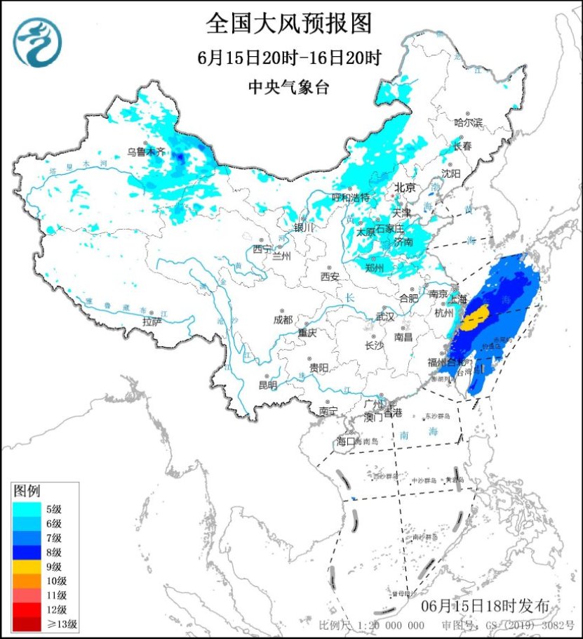 6月15日20时至16日20时,新疆东部、内蒙古中东部、华北、黄淮、江淮东部以及浙江东部等地的部分地区有5~6级、阵风7~8级的大风;东海大部海域、台湾海峡、台湾以东洋面将有7~8级、阵风9~10级的大风,其中东海西部海域、浙江东部沿岸海域风力可达9级、阵风10~11级(见图2)。中央气象台6月15日18时继续发布大风蓝色预警。