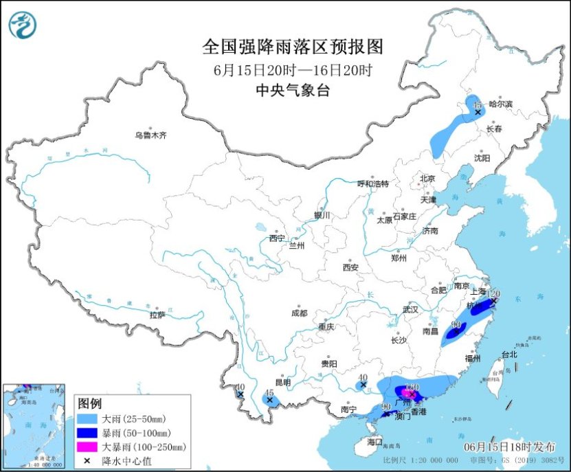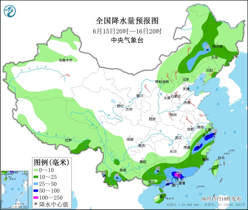 受“蝴蝶”残余环流和冷空气及西南季风共同影响,6月15日20时至16日20时,浙江中北部和西南部、江西东北部、福建西北部和南部沿海、广东、广西东部、云南南部等地的部分地区有大到暴雨,其中,浙江东北部、广东中南部等地局地有大暴雨(100~160毫米)(见图1);上述部分地区伴有短时强降水(最大小时降雨量20~50毫米,局地可超过70毫米),局地有雷暴大风等强对流天气。中央气象台6月15日18时发布暴雨蓝色预警。此外,内蒙古东南部、吉林、黑龙江西部等地有中到大雨。