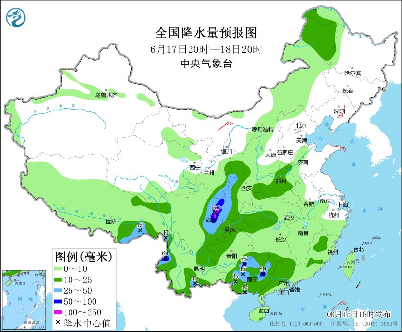 6月17日20时至18日20时,内蒙古东北部、西北地区东部、黑龙江西北部、黄淮西部、湖北南部、西南地区东部、西藏东部、云南西南部、华南大部等地部分地区有中到大雨,其中,四川盆地西北部和中部、云南西南部、广西西北部和东南部等地部分地区有暴雨或大暴雨(100~130毫米)。内蒙古西北部、辽宁东部、山东半岛等地部分地区有4~5级风(见图5)。